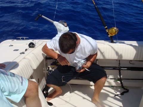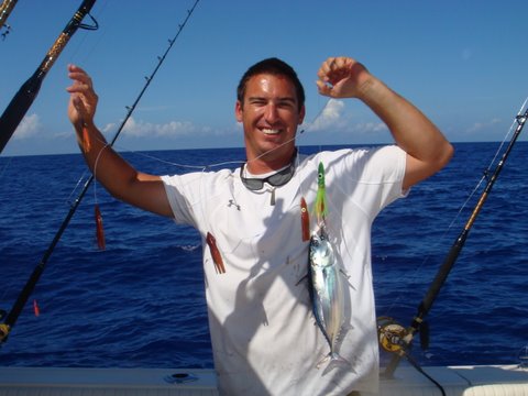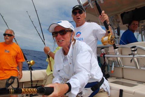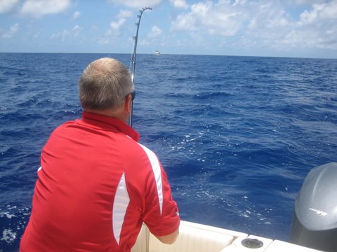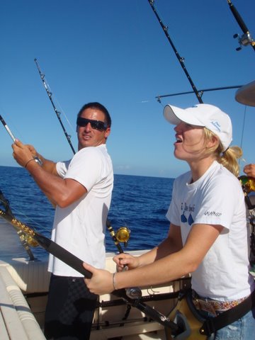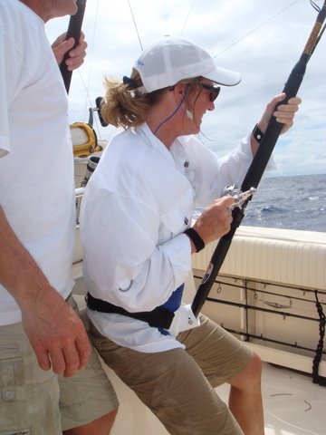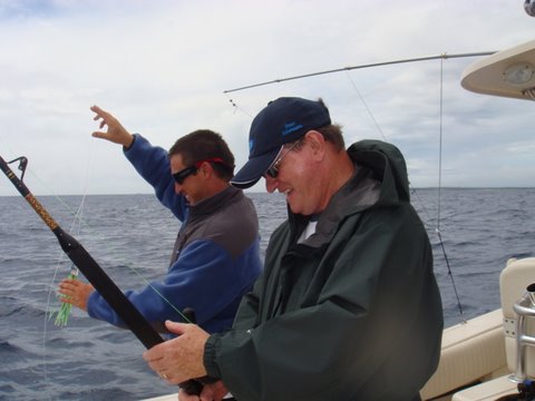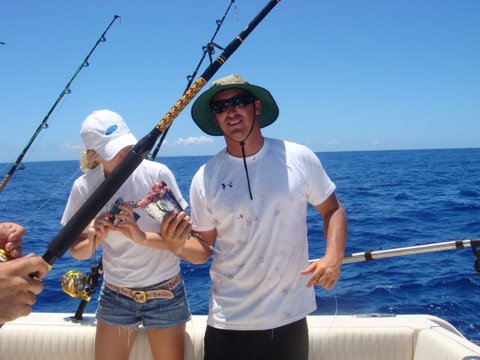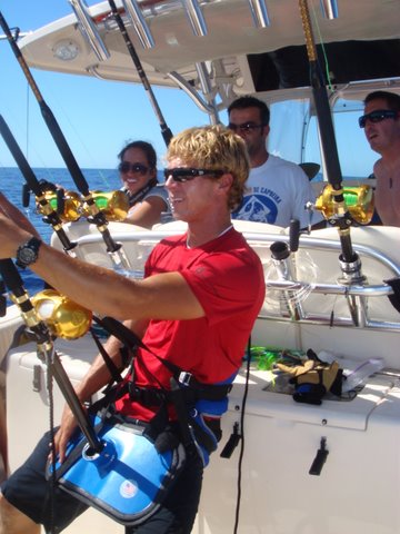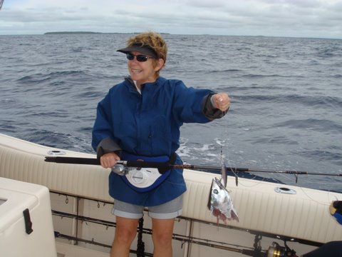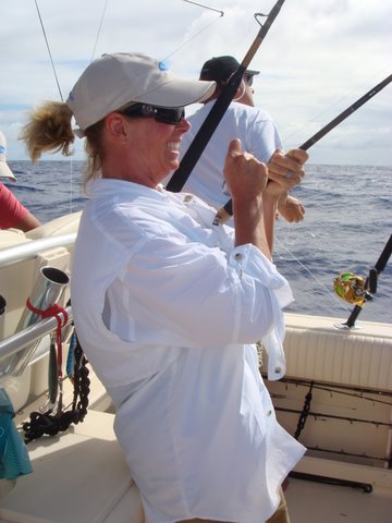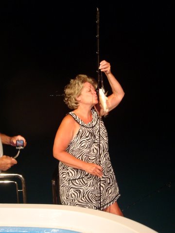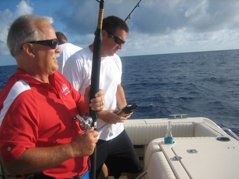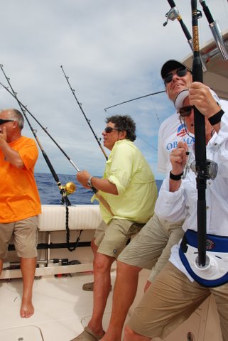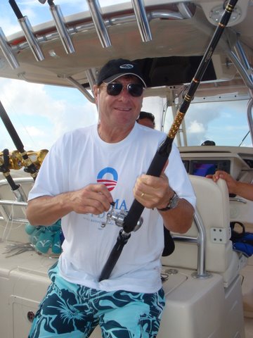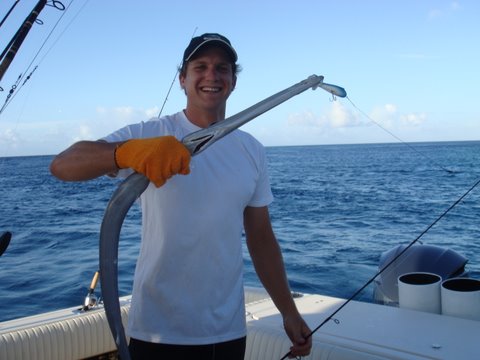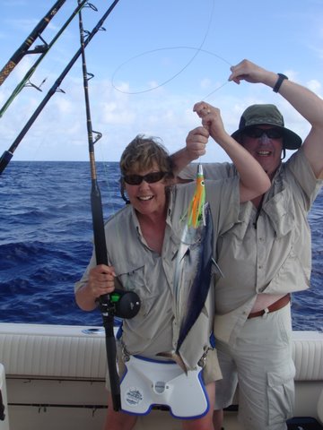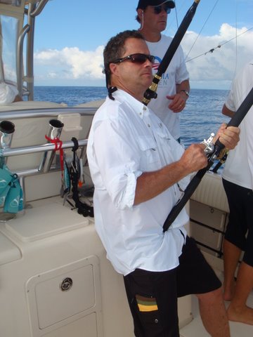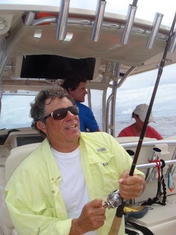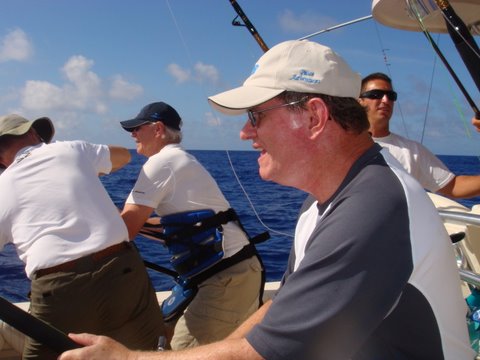 A huge Marlin came flying out of the water less than 20 yards behind the boat, swallowed John's Skippy he was retrieving, and John screamed "What the ---- do I do now?" |