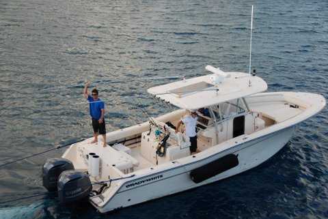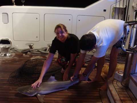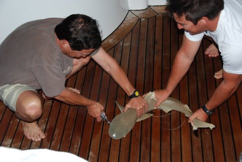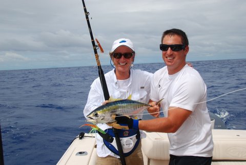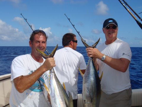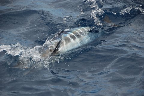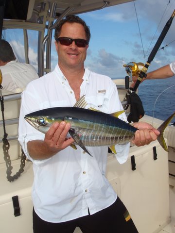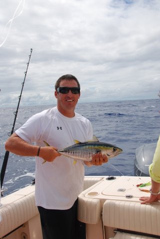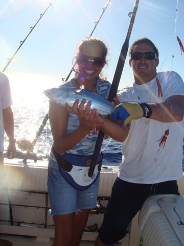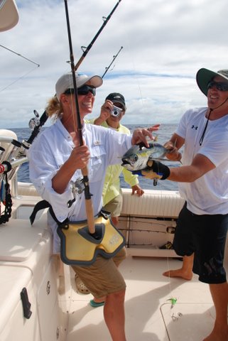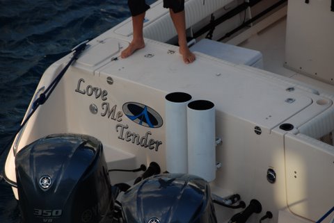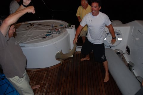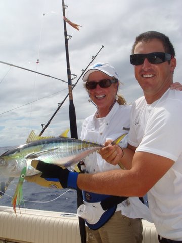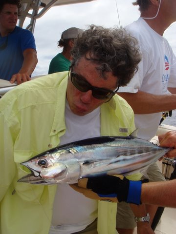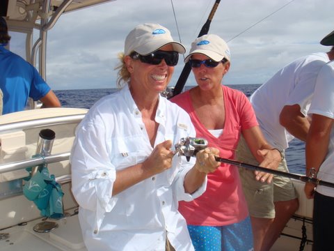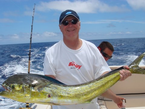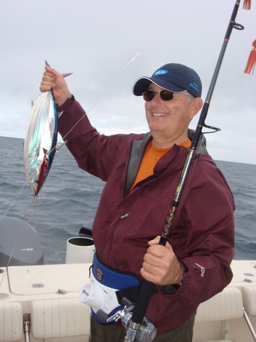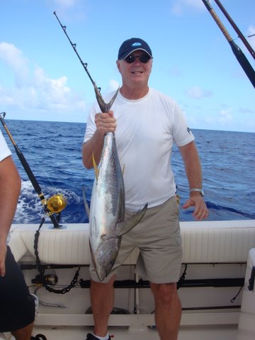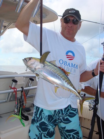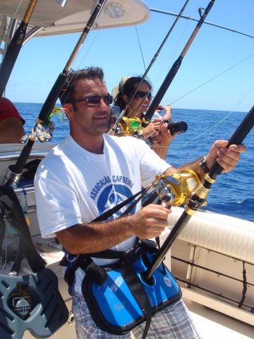 A huge Marlin came flying out of the water less than 20 yards behind the boat, swallowed John's Skippy he was retrieving, and John screamed "What the ---- do I do now?" |